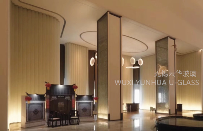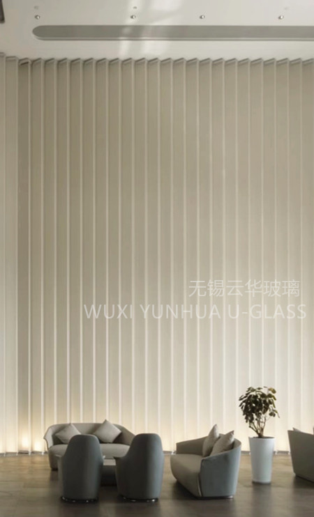 選用無錫云華K25*90*8超白波浪紋鋼化噴砂U型玻璃